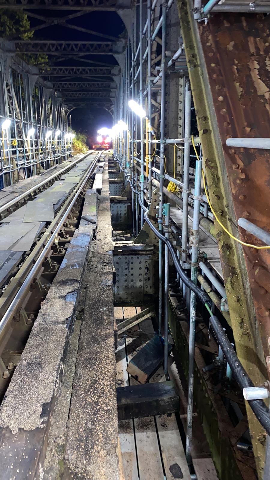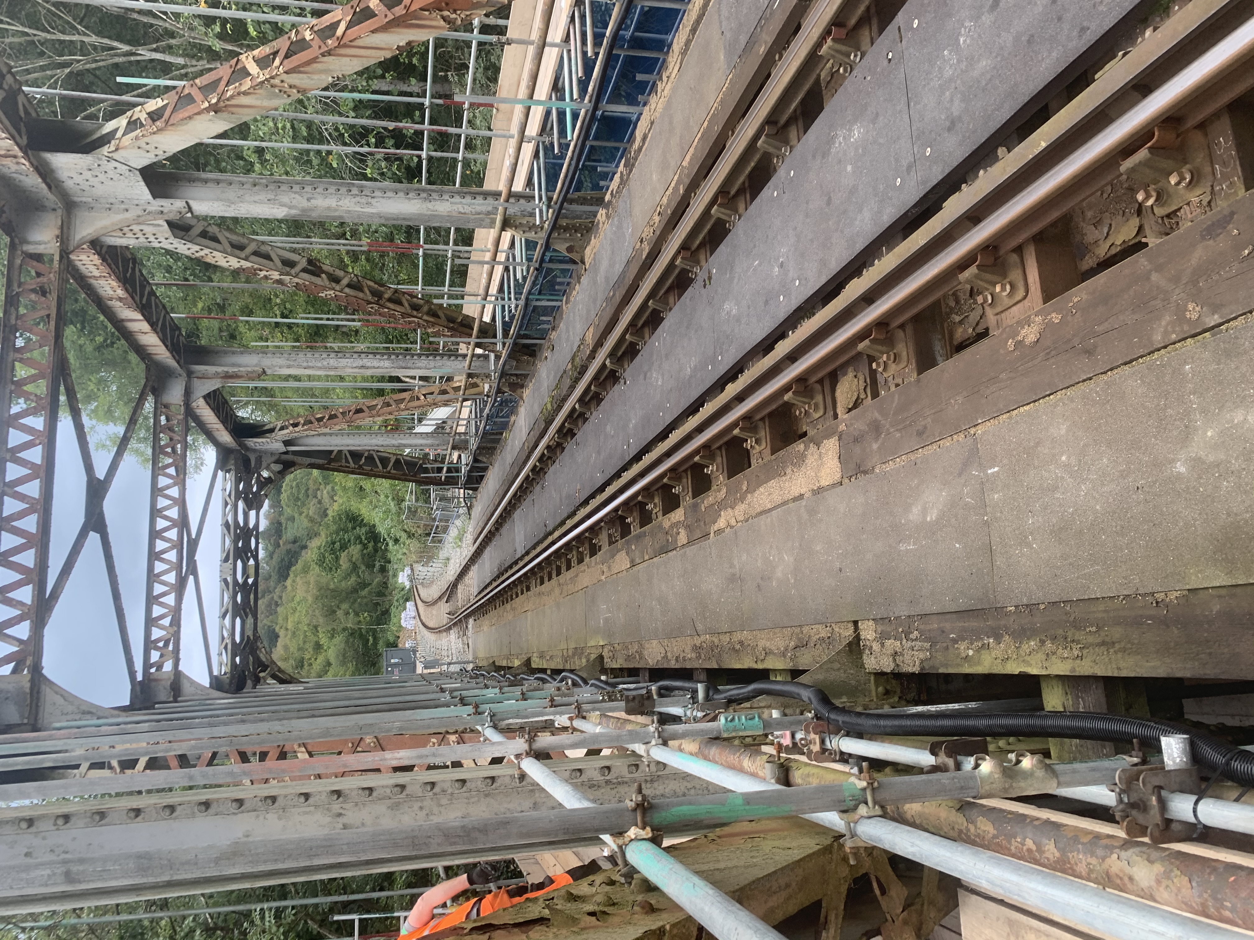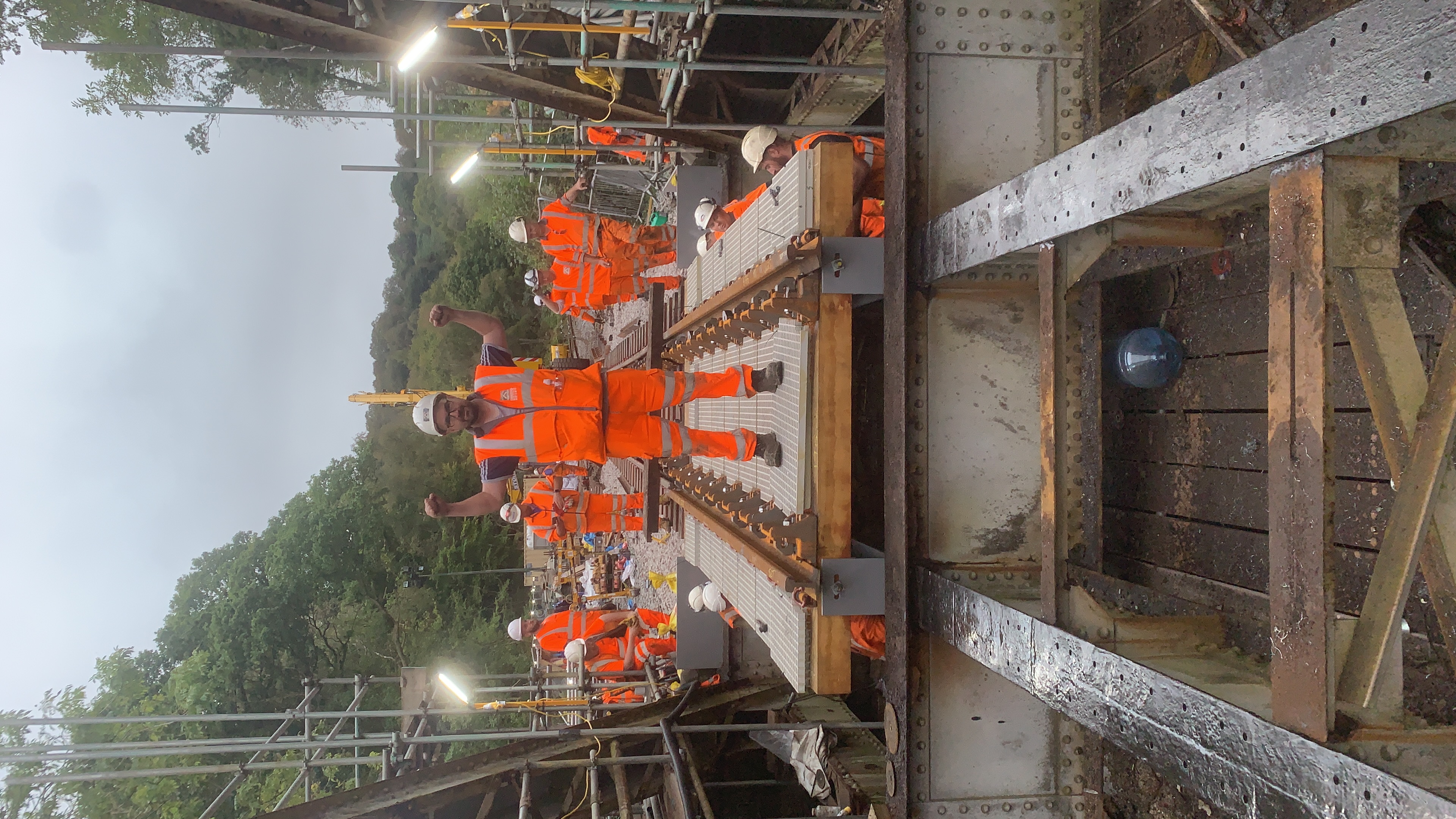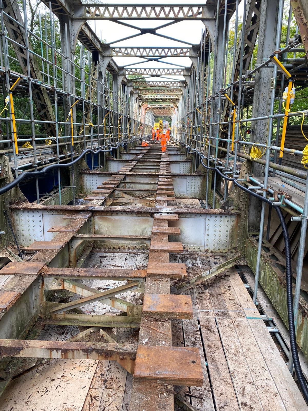 The existing track and walkway were removed in panel form and retreated across the bridge with an RRV and loaded to train for removal. As soon as the panels were removed Lanarkshire welding completed works and minor repairs to the beams to allow for the installation of the new panels. This involved the removal of packing plates and drilling new bolt holes throughout the structure.