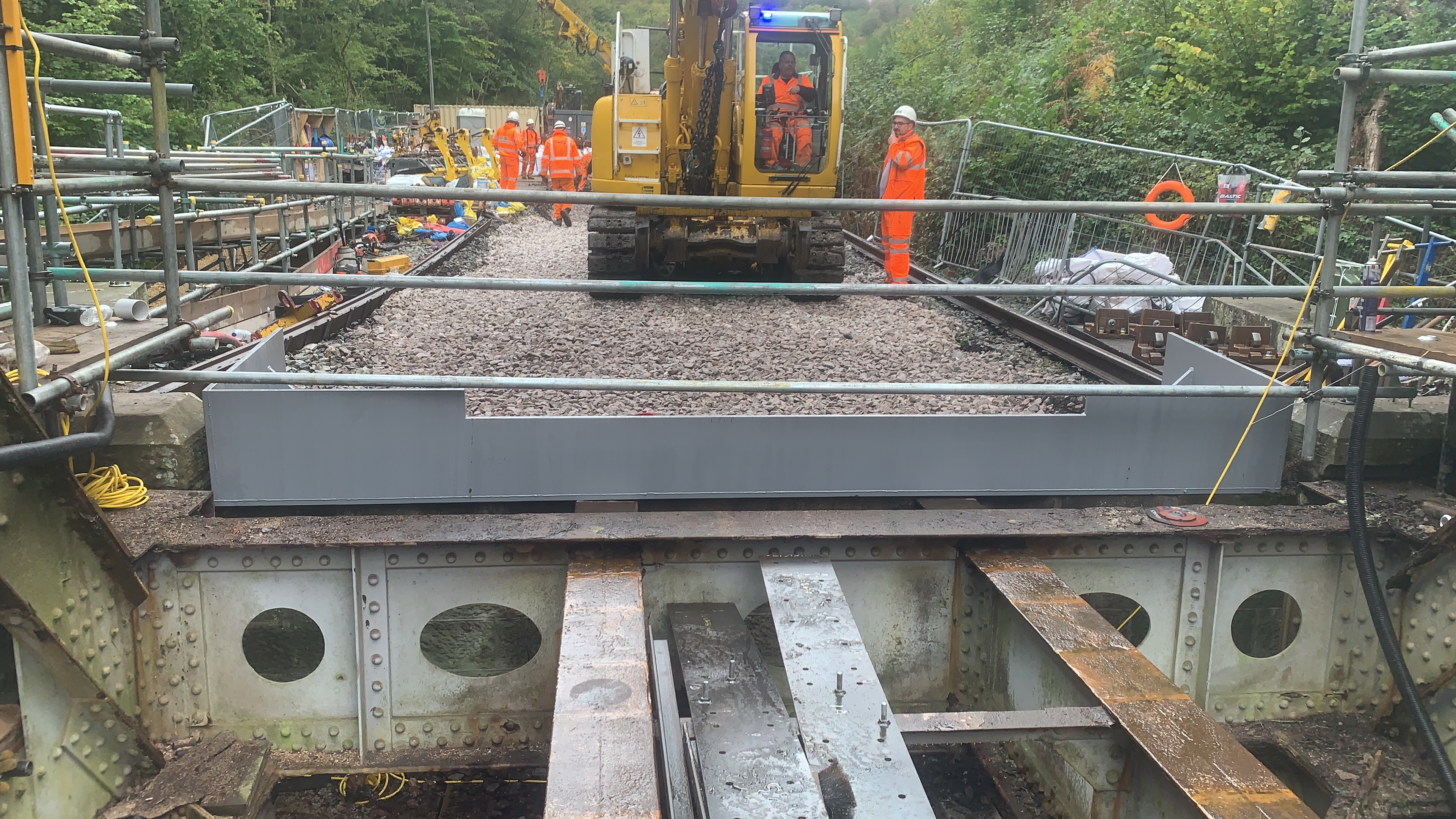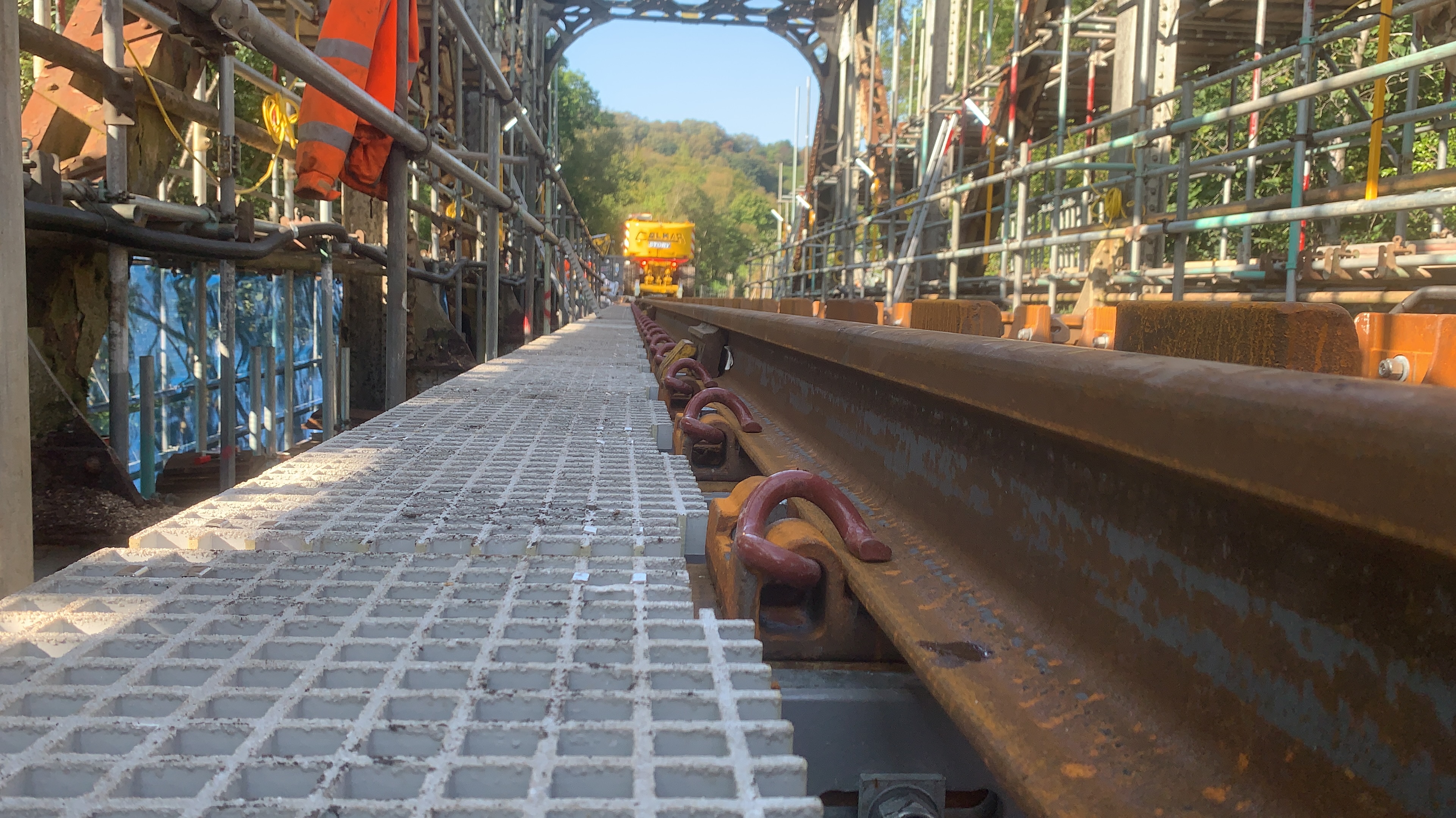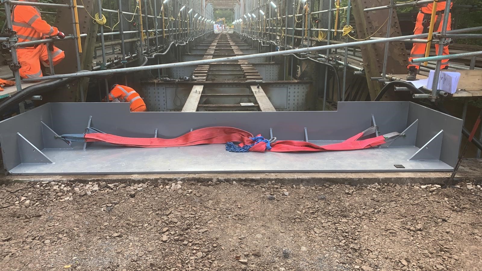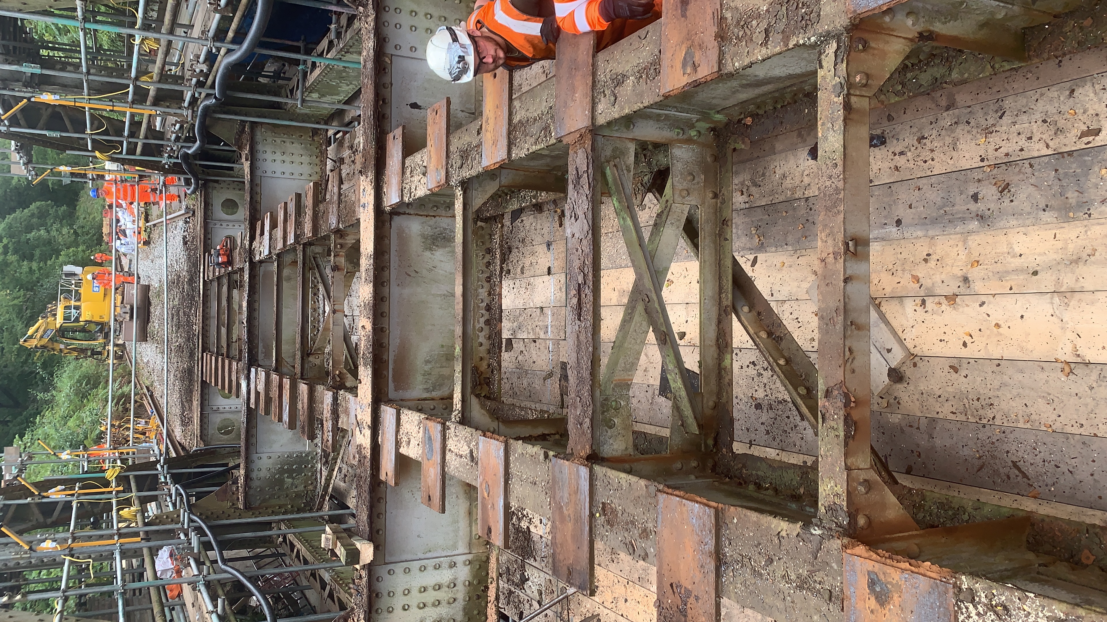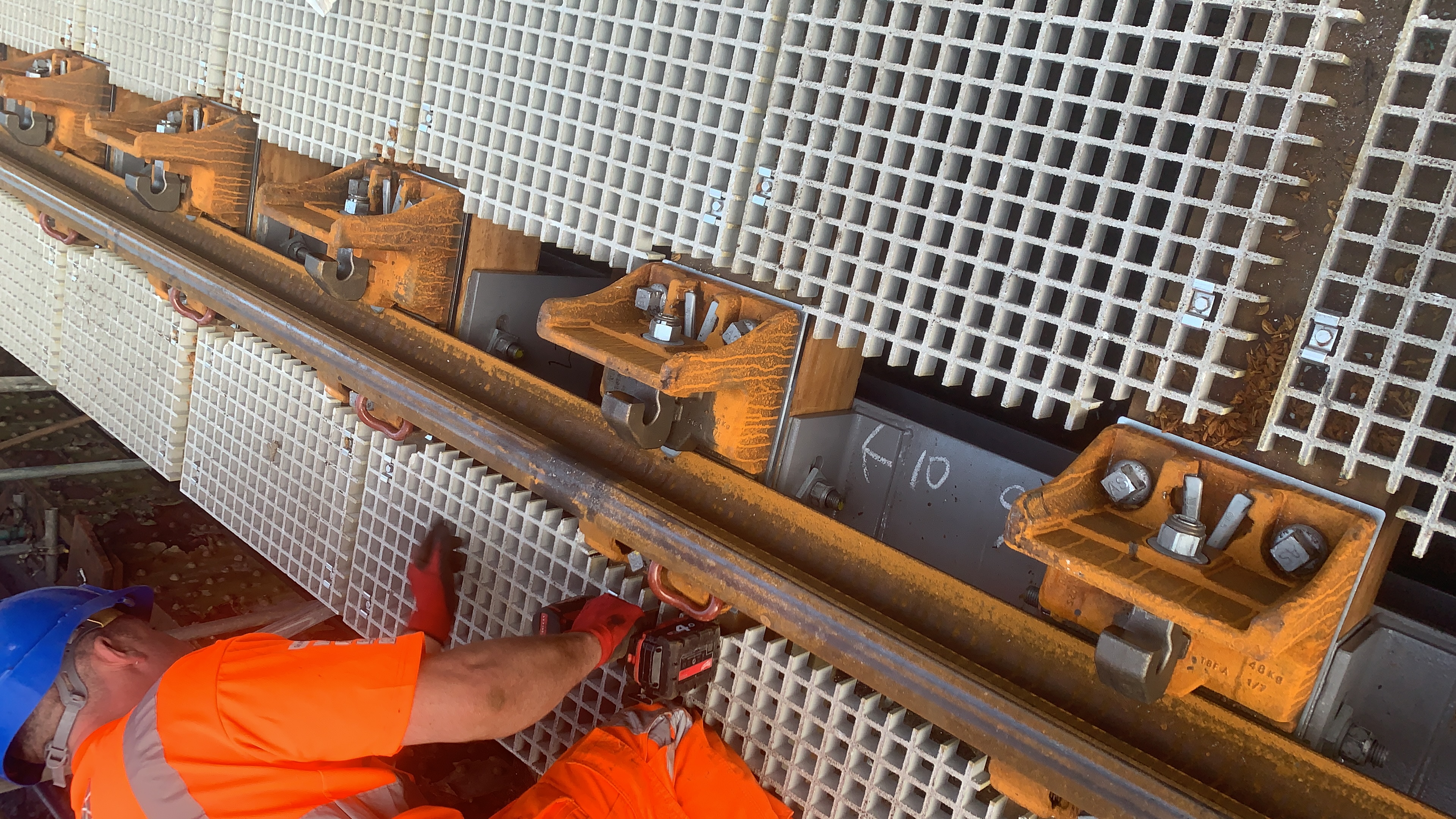 The existing track and walkway were removed in panel form and retreated across the bridge with an RRV and loaded to train for removal. As soon as the panels were removed Lanarkshire welding completed works and minor repairs to the beams to allow for the installation of the new panels. This involved the removal of packing plates and drilling new bolt holes throughout the structure.